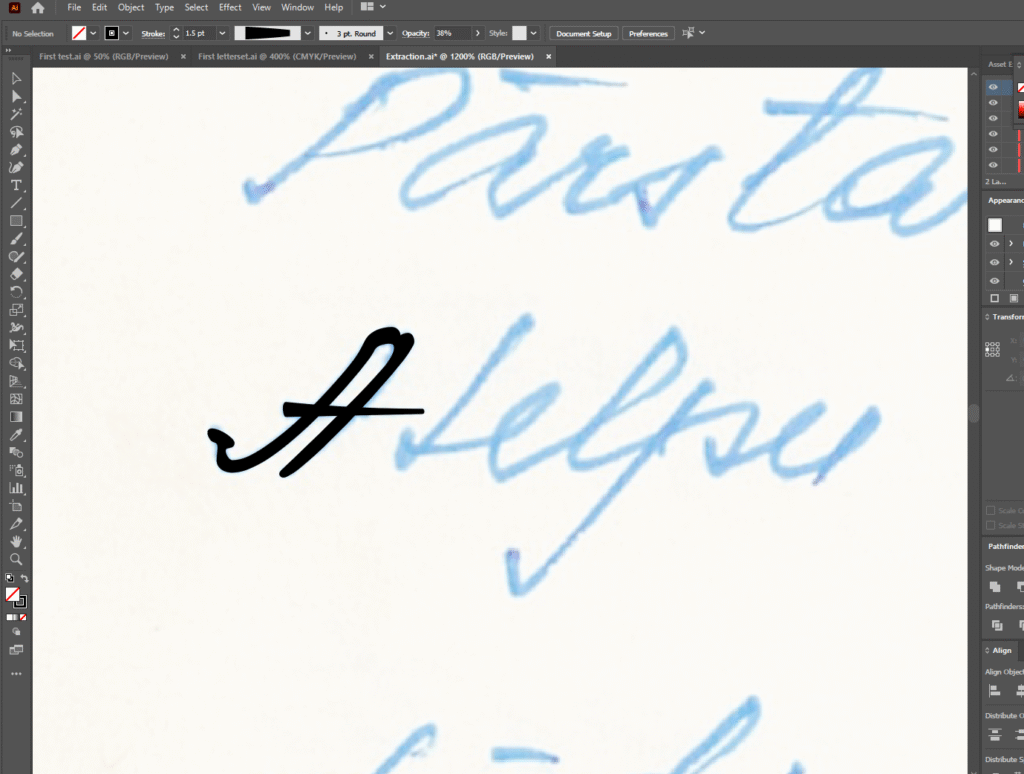 At first I tried to extract what I can from the existing reference photos – a couple of postcards and notebook pages. That proved ineffective, so I resorted to tracing the letters by hand. Hands down, the most experience I’ve ever gained with the pen tool.